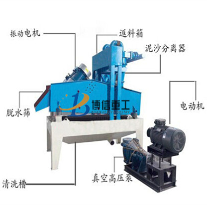 細(xì)沙回收機(jī)整套設(shè)備主要由振動電機(jī)、真空高壓泵、泥沙分離器、脫水篩、清洗槽、返料箱等組成。